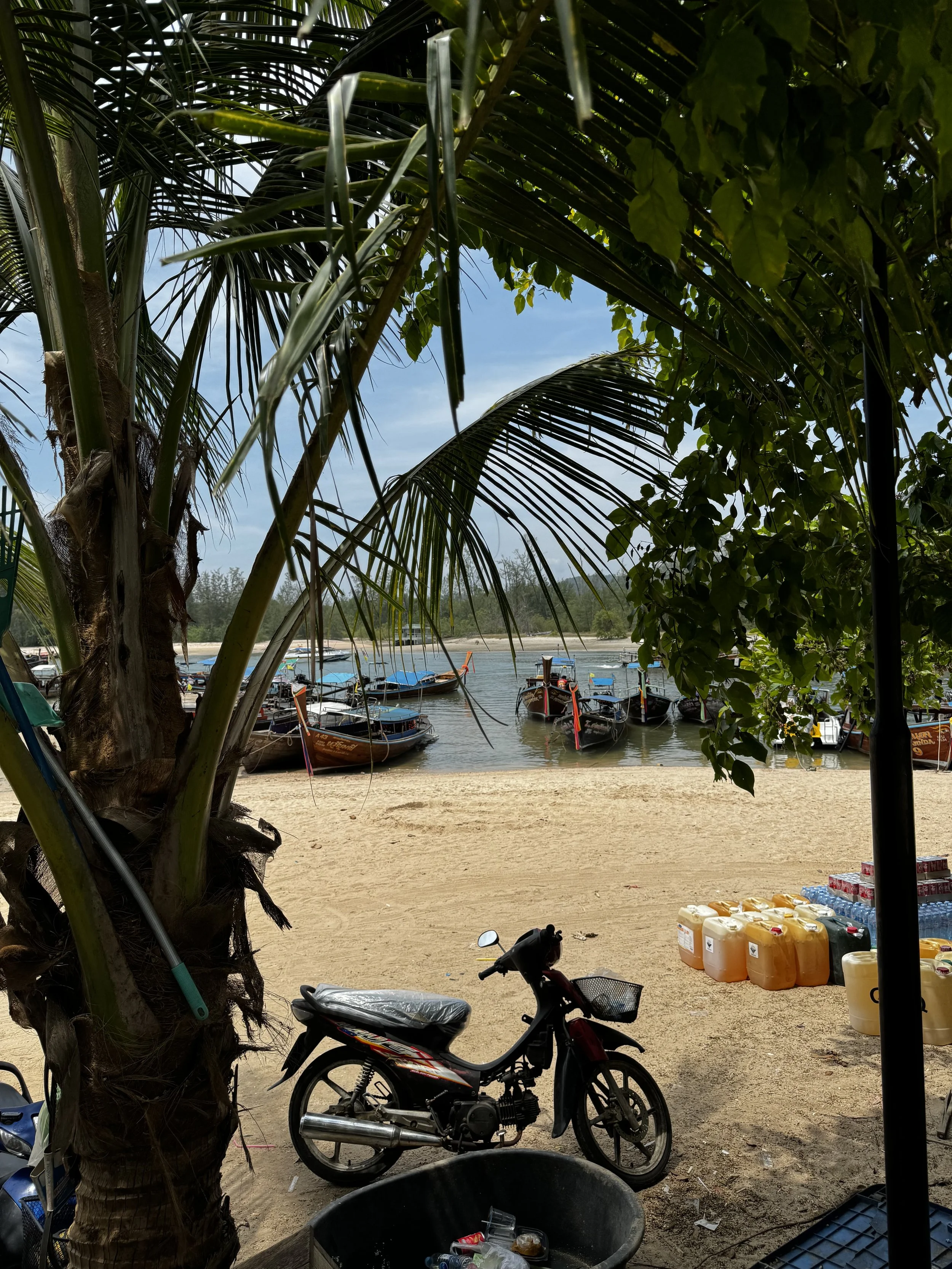 Unser Glück war ja, dass wir das gleiche Taxi, das uns hierherbrachte, auch für den Rückweg nach Ao Nang nehmen konnten. Der Chef des Unternehmens hat uns auch gleich ein Longtailbost nach Tonsai Beach organisiert, da Tonsai Beach ein eigener abgeschlossener Beachabschnitt war zwischen Ao Nang und Railay, den man (zumindest nicht mit Koffern) nur erschwert oder gar nicht zu Fuss erreichen konnte.
