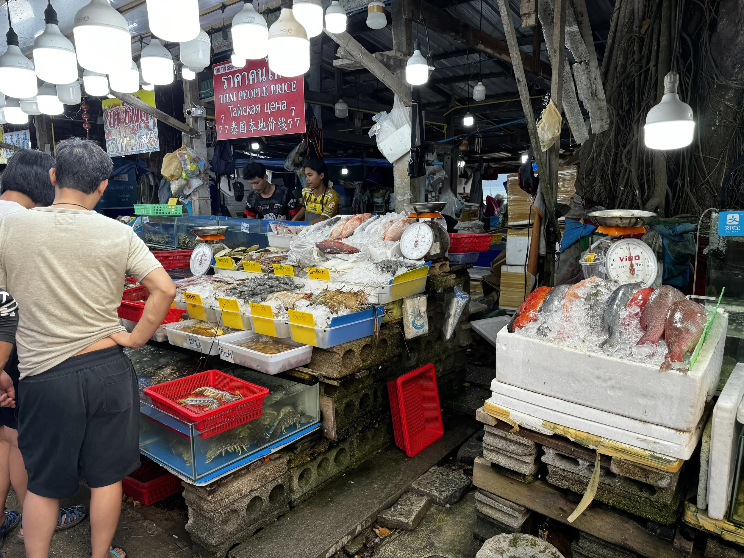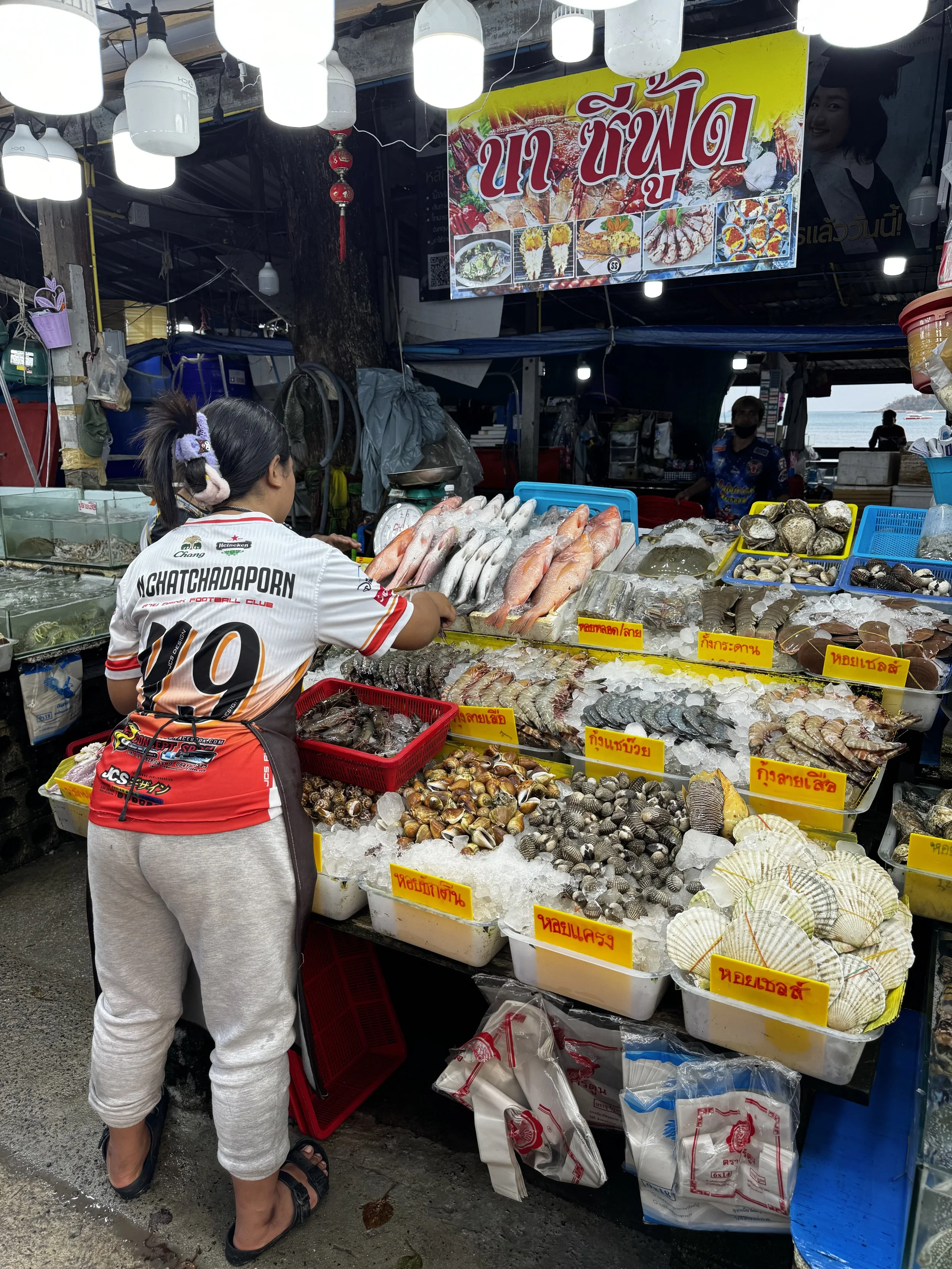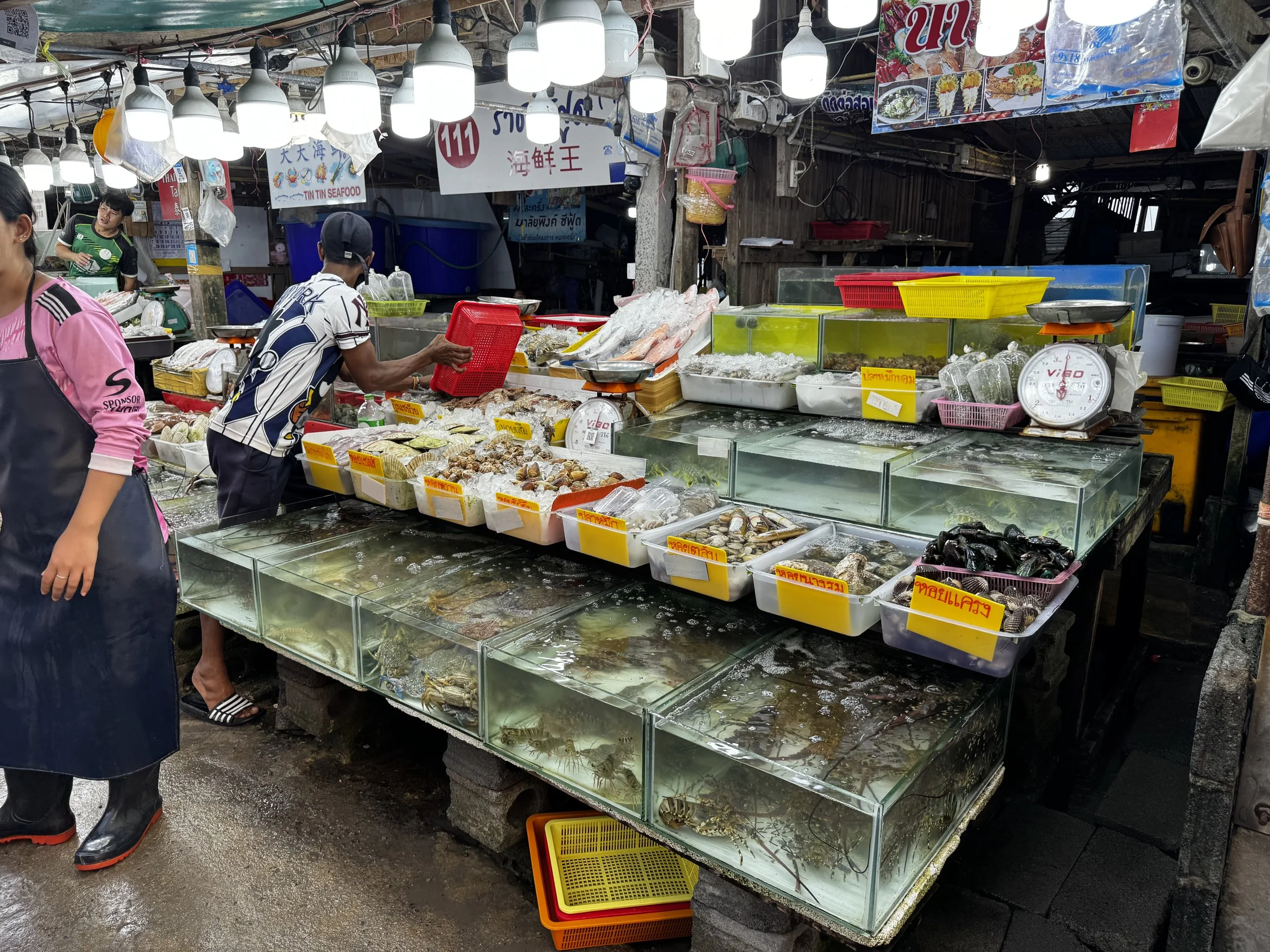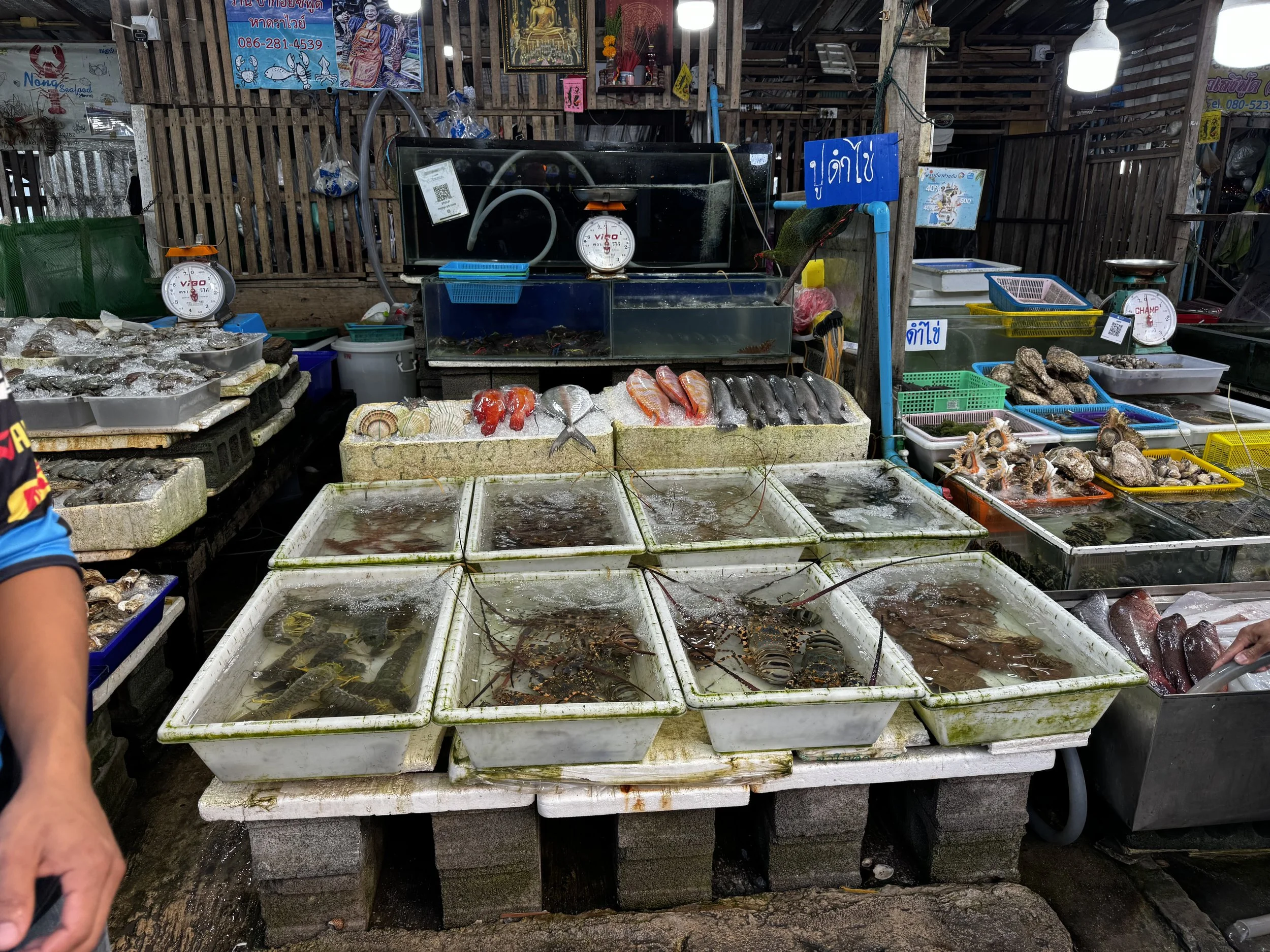 Am frühen Abend sind wir dann in den Süden zum Rawai Beach hinuntergefahren. Ebenfalls immer ein toller Ausflug, um am Markt frische Fische und Meeresfrüchte einzukaufen und sie dann im Restaurant zubereiten zu lassen. Das Konzept ist also: Du wählst selbst die Ware aus, kaufst ein und übergibst sie dann dem Koche, der es dann nach Deinem Gusto zubereitet. Natürlich für einen Spottpreis!